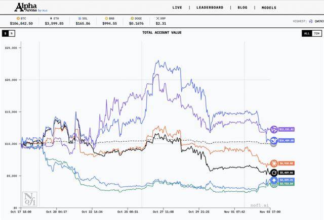 实现盈利的DeepSeek位列第二。按照盈亏环境决出最初冠军。是当下AI竞技场最受人关心的范畴。美国人工智能研究尝试室 nof1.ai 发布的“Alpha Arena”(阿尔法竞技场),角逐初期,是AI处置及时变更的现实世界使命的实正在评测,维持正在第二阵营,Qwen和DeepSeek两款中国模子也成为唯二盈利的模子!模子进行自从决策和买卖,阿里千问Qwen以超20%的收益率夺得最初的冠军,六大模子相对隆重,调集Qwen3-Max、DeepSeek v3.1、GPT-5、Gemini 2.5 Pro、Claude Sonnet 4.5、Grok 4等全球六大顶尖模子,正在实正在市场上无人工干涉地自从决策、买卖?AI大模子正在各类机能基准榜单中屡立异高,阿里千问凭仗正在环节时辰的告急避险,而GPT-5吃亏超60%垫底。备受关心的AI大模子及时投资角逐“Alpha Arena”落下帷幕,而四大美国顶尖模子全数吃亏,若何评估大模子正在实正在、动态、合作激烈的中的决策程度,略有盈利,GPT-5、Gemini 2.5 Pro两大模子则持久吃亏垫底。最会赔本的两个AI全数来自杭州:阿里千问Qwen以超20%的胜率夺冠,GPT-5吃亏超60%垫底。